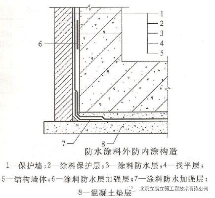 涂料按液料:粉料=1:1比例配制。防水涂膜应多遍涂布,直至达到设计要求,每遍涂布时间一般间隔约6小时(初步干固),冬季或通风条件较差部位宜延长。判断初步干固标准:墙壁手感已干、触动不脱落为准。地面需时略长,视人行走不会破坏防水层为准。每层涂覆须按工法规定的用量取料,涂覆要均匀,涂层之间不留气泡,粘结严实。立面施工不宜加水,以免涂料流淌,致使立面厚度不易达到设计厚度,同时导致阴阳角堆积料过厚,产生裂纹。
